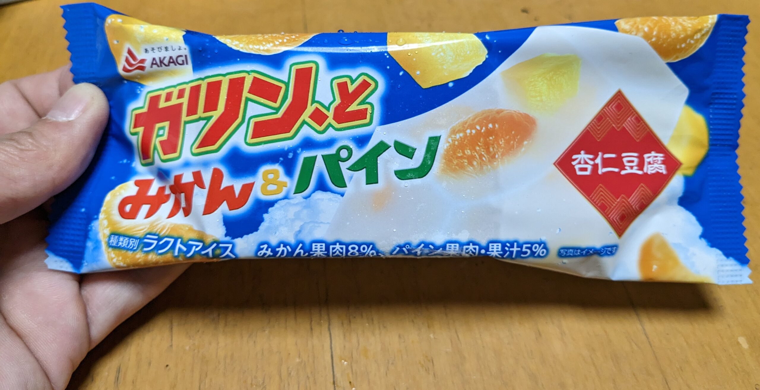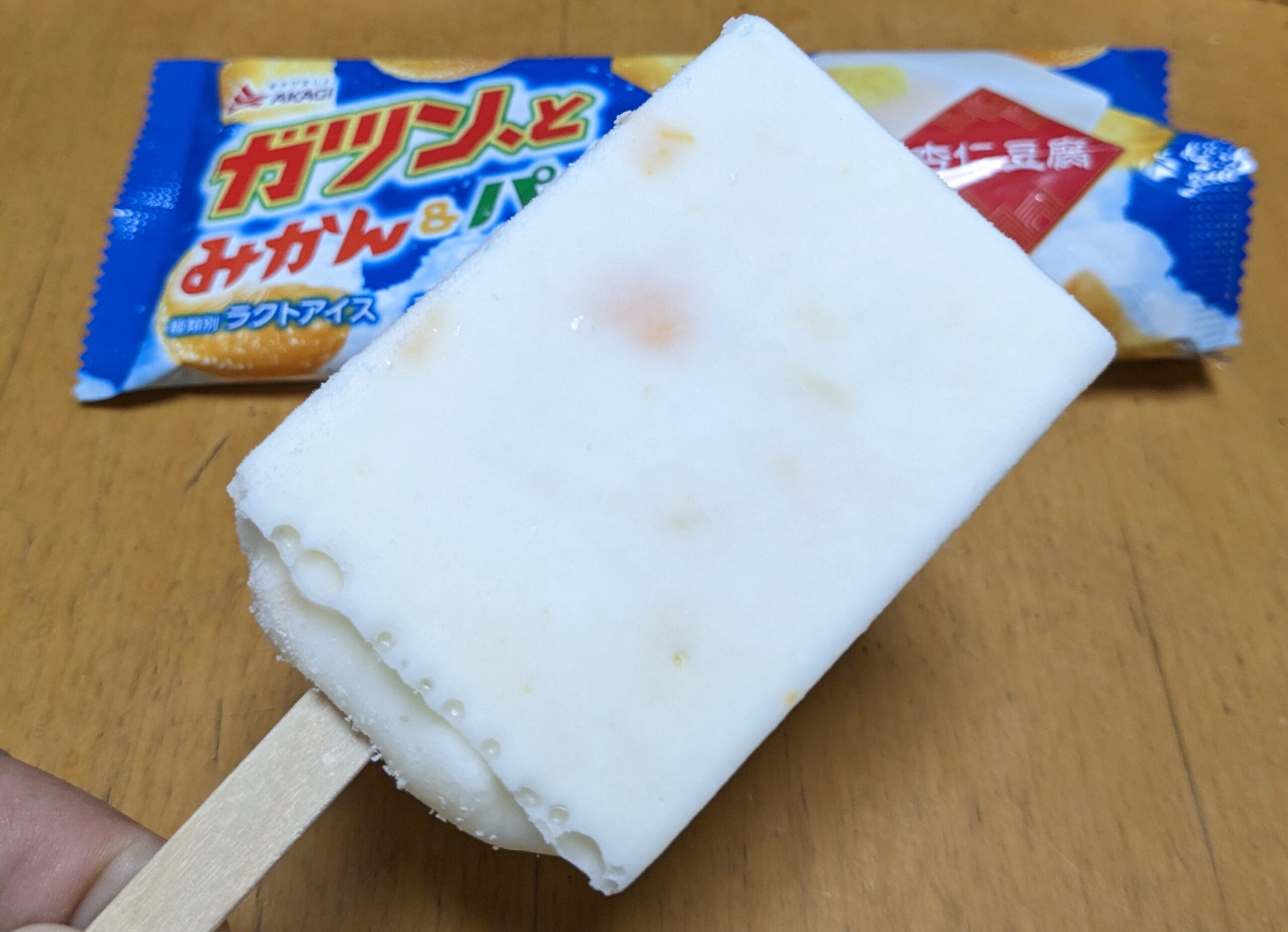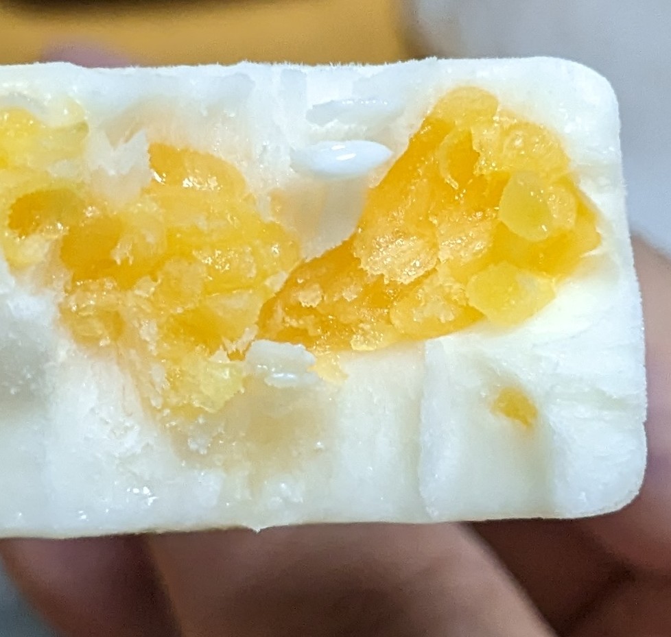 一口食べれば、口の中に広がる杏仁豆腐の爽やかな甘みが。口どけもよく、シャリシャリとした歯触りが涼しさを引き立たせます。「みかん果肉8%、パイン5%果汁・果肉」と表されていて、そんなに入っていないイメージでしたが、口に含むとみかんやパインの存在は感じられます。