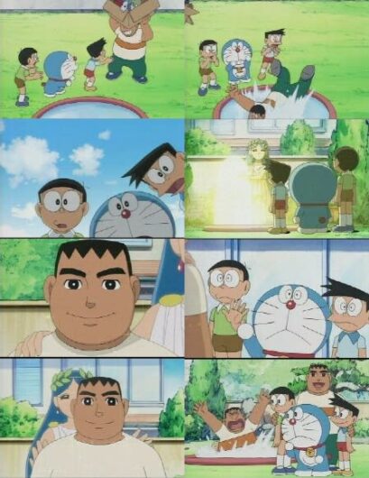 「あなたたちが落としたのはこのきれいなジャイアンですか?」と尋ねる女神ロボットに対し、ドラえもんとのび太が「いえ、もっときたないの!」と答えてしまったため、