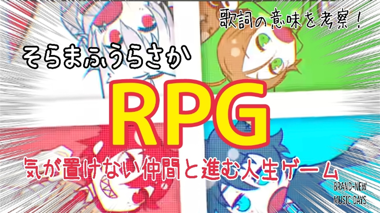 全体を通して言えることは、歌詞に描かれているのは『登場する4人がゲームをしながら繰り広げるドタバタ劇』のような感じだということ。そのゲームが「RPG(ロールプレイングゲーム)」であり、各々のキャラクターを操作し、架空の状況下で与えられる試練を乗り越え目的を達成していくものになります。