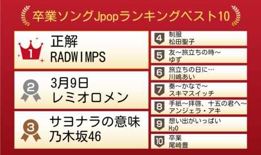 今回は、そんな卒業証書授与式や謝恩会などで心に響くJpopをランキング形式でお伝えします。