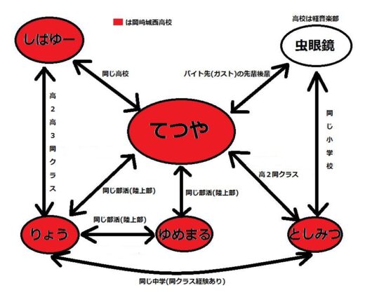 りょうとしばゆー、てつやととしみつが高校のクラスメイト。
