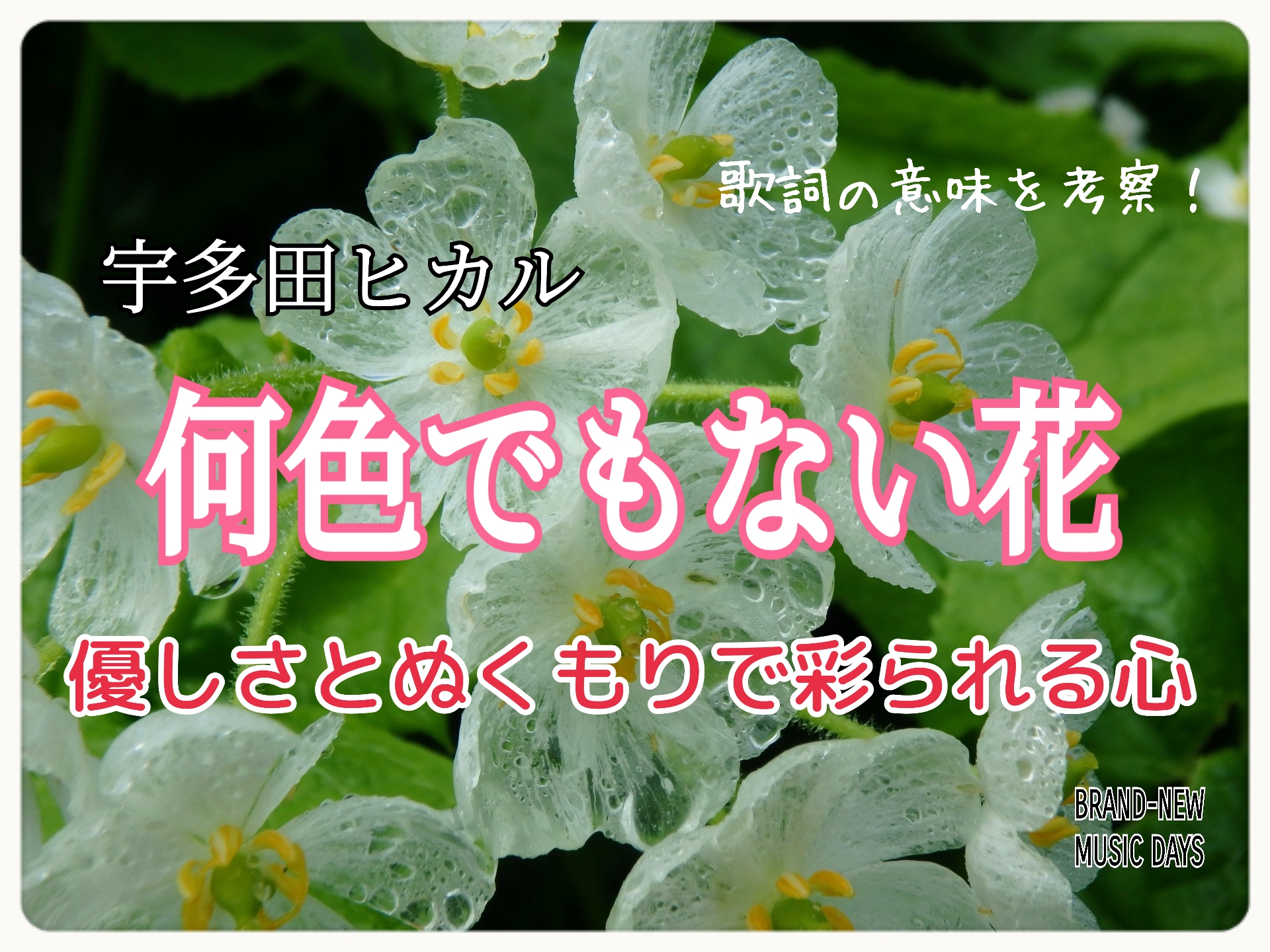 そして『心を開く』、『花開く』という言葉があるように、再会した二人が過ごす日々の中での「何気ない会話」や「さりげない仕草」を「何色でもないもの」だと考えた時、この花は「互いを想い合う心」そのものを指すのではないかと筆者は考え、この歌が伝えたい想いの本質を 優しさとぬくもりで彩られる心 としているのです。